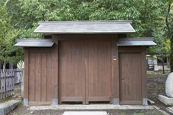 「鷗外の門」は、かつて当館の敷地内に建っていた官舎の門で、東北隅の散策道の一角にある。木造で屋根は銅板葺き。