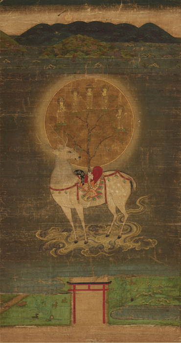 该作品是以御盖山和春日山为背景,用细致的笔触描绘了被寓意为春日神之使者的神鹿从天而降的画面。在马鞍上的神木枝头上,呈现出了春日社祭神本来的姿态—五尊佛菩萨。