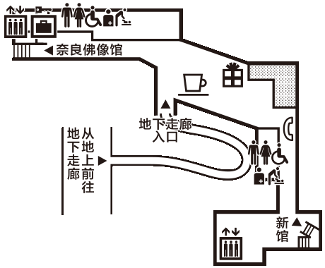地下回廊 地下回廊馆外入口 学习区(佛像模型) 休息区 纪念品商店 餐厅 这条贯穿奈良佛像馆和东西两新馆的150米长廊,于1997年竣工。属于自由活动区域,免费开放。从奈良佛像馆和新馆以及馆外入口,都可直接进入。地下回廊设有博物馆纪念品商店和餐厅。商店销售诸多文创商品,以及与历史、美术相关的书籍。地下回廊中,在通向奈良佛像馆附近设有免费展示区。以通俗易懂的方式,向来馆的客人介绍佛像模型以及佛教美术。