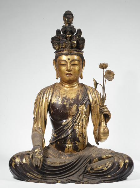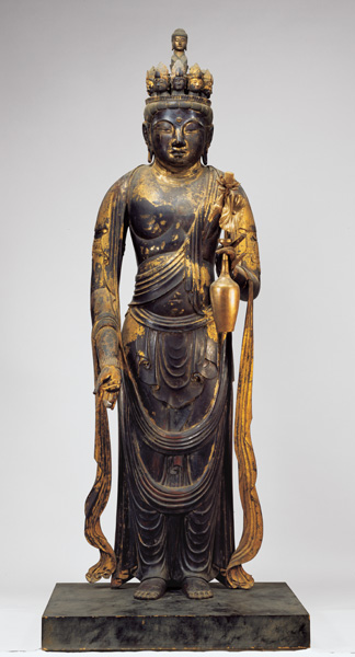 Heiso (926–1002) served as the abbot of Tōdaiji. This statue was the principal icon (honzon) of Zenjōji, the temple he founded, which was completed in around 995 (Chōtoku 1). The statue dates to around the same year. Its steadfast expression and impactful frontality call to mind examples of dry lacquer statuary from the Nara period (710–794). This is an important icon reflecting the style of Buddhist sculpture developing in the Nara area at the time of its production.