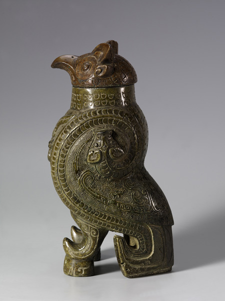 This wine vase (Chinese: zun) is shaped like an owl, with the body serving as the vessel portion that stored liquid and the head serving as the lid. It is very unusual, with only a few like it in existence. Vessels shaped like owls were popular during the Shang dynasty.