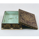外面は蘇芳(すおう)で染められ、金銀泥(きんぎんでい)で文様(もんよう)が描かれている。蓋表には唐花文(からはなもん)と蝶や鳥が表され、身側面には唐花文と双鳥が描かれる。底裏には獅子を思わせる霊獣と綬帯(じゅたい)を銜(くわ)えた鳳凰が重ねて描かれ、周囲に飛雲(ひうん)と蝶鳥文が配される。蓋身の内部は白緑(びゃくろく)地に白色の小花文が散らされている。