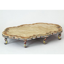 仏に献納する品々を載せた華麗な台机。ヒノキ材製で、天板は長八稜形(ちょうはちりょうがた)にかたどり、8脚の華足(けそく)を直付(じかづ)けする。天板の側面には青系の暈繝(うんげん)帯の地に赤系色の小花菱文(しょうはなびしもん)と覗(のぞ)き花文(かもん)を上下に配し、華足も同様に青系の暈繝の地に赤系色の花弁を表す。
