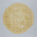 円形に切られた白い綾(あや)で、樹下に鳳凰(ほうおう)や山羊(やぎ)が向き合う文様を表している。樹下双獣文はササン朝ペルシアに起源を持つといわれ、小さな裂の中にも異国情緒を味わうことができる。本品の周囲には縁裂(ふちぎれ)をめぐらしたような痕があり、もとは献物几(けんもつき)の褥(じょく)であったかと推測される。