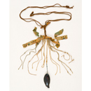 高位の人々が身につけた佩飾具(はいしょくぐ)。魚形は深紅の透明な琥珀(こはく)製で、口や眼、ひれ、鱗などを緻密な線彫りを施し表している。繋着紐(つなぎひも)には褐色羅(かっしょくのら)が結びつけられているが、これは間縫刺繡羅帯残欠(まぬいのししゅうらのおびざんけつ)(出陳番号29)とまったく同じものであることから、もとは両者が一連のものであったことが分かる。天平期の服飾文化を伝える品である。
