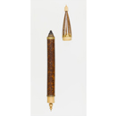 筆は宝庫中倉(ちゅうそう)に実用的なものが17管伝わる。本品の穂は近時の調査で、3段構造で狸毛が使用されていることが判明した。管はマダケ属の斑竹(はんちく)で、細かな天然の斑紋が観察される。管の両端に取り付けられる毛彫(けぼり)が施された金製の覆輪(ふくりん)や、尾端の象牙(ぞうげ)製の塔形飾りといった精緻な細工はみごとである。