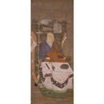 払子(ほっす)を手に執(と)り、法被(はっぴ)を掛けた椅子に坐す忍性を描く。突き出た頭頂、赤い鼻先といったトレードマークが明瞭。受戒(じゅかい)などに用いる戒尺(かいしゃく)・柄香炉(えごうろ)・三衣包(さんえのつつみ)を机に置くことから、そのような法会に懸けられたと考えられる。