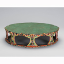 仏前への供物(くもつ)をのせる献物(けんもつき)。宝庫には東大寺の法要(ほうよう)や天皇・廷臣(ていしん)からの献物に用いたとみられる献物几が多数伝わるが、本品はその中でももっとも華麗な遺例として知られる。八稜形(はちりょうがた)(八方の先端が花弁(かべん)状に尖(とが)った形)の天板に、花先形(はなさきがた)の格狭間(こうざま)をもった床脚(しょうきゃく)と畳摺(たたみずり)がつく。表面全体に彩色(さいしき)が施され、特に側面に描かれた赤・青・緑・紫系の暈繝(うんげん)彩色(同系統の色を濃色から淡色に段階的に配列する彩色法)による花文は鮮やかである。