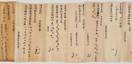 写経の筆に関する帳簿で、宝亀5年(774)に官営の写経所で作成された。写経所で経文の筆写を担当する経師(きょうし)は、一定量の写経をすると消耗した筆を新しいものと交換することになっていたが、このとき経師自身がそれまでに筆写した経典名と紙の枚数を申告する必要があり、この申告書のことを筆手実(ふでしゅじつ)といった。この巻は、同年7月から10月に提出された多数の筆手実を、写経所の事務担当者が貼り継ぎ、管理用の台帳としたものである。
