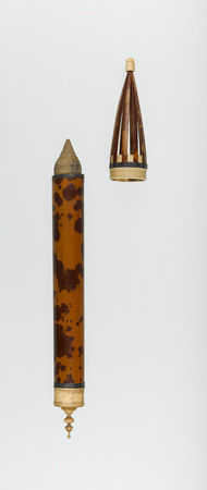 筆記用の毛筆。現代の筆は、筆先を毛(獣毛)のみで作るが、正倉院に伝来する筆は、中心に芯となる毛を立ててその周りを紙で巻き、さらに数回にわたって毛と紙を交互に巻き付けて作られている。本品の筆管は表面にまだら模様が表れる斑竹(はんちく)材で、上下には銀が巻かれる。ふたを伴い、尾端は象牙(ぞうげ)を用いた塔形で装飾されるなど、美しく飾られた文房具である。
