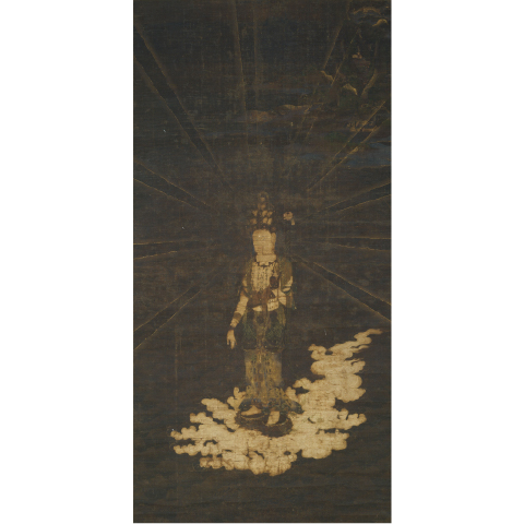 雲にのり、海上を飛来する十一面観音を描いた画像です。後方の補陀落山(観音の浄土)には、船で渡海してきた人びとや中腹の楼門、山頂の楼閣までが精緻に描き込まれています。観音の衣に施された緻密な文様や繊細な截金による衣文の描写も注目されます。二月堂修二会の本尊が、補陀落山から海を渡り飛来したという説話を想い起こさせます。
