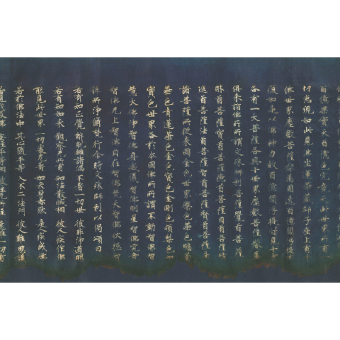 修二会期間中の2月5日(現在では3月5日)の実忠忌に用いられたと考えられている六十巻本の『華厳経』で、江戸時代に二月堂が全焼した際、焼け跡から発見されました。一部は焼け焦げながらも、紺色の料紙に浮かび上がる銀色の文字は独特の美しさを醸し出しています。
