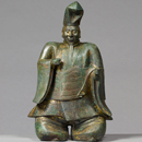 当館では、平成24年(2012)に開催した特別展「頼朝と重源―東大寺再興を支えた鎌倉と奈良の絆―」で伊豆山神社より銅造伊豆山権現像を拝借し、同社の歴史と信仰の一端を紹介する機会を得ました。この像は、鎌倉時代にさかのぼる伊豆山権現像の優品でありながら、全身に広がる腐蝕(ふしょく)がいちじるしく、とりわけ面相部を覆う分厚い錆(さび)が像容の正確な把握を困難にしておりました。このたび、奈良文化財研究所の協力のもと保存修理を実施し、像表面の錆落としを行ったところ、下層から造立当初の威厳ある顔立ちが現れ、またまばゆい輝きを放つ鍍金(ときん)が多く残存していることが判明するなど、特筆すべき成果を得ることができました。