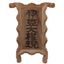 かつて伊豆山に懸(か)けられた扁額(へんがく)。額面に「伊豆大権現」の5字を浮彫(うきぼり)する。文字には鳥や蛇をかたどった箇所があり、何らかの由緒(ゆいしょ)を想起させる。酒井姫路藩第三代藩主・酒井忠道(さかいただひろ)の揮毫(きごう)・寄進(きしん)である。