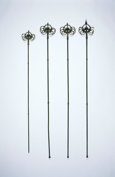 錫杖は僧侶(そうりょ)の用いる道具で、山野での遊行(ゆぎょう)や托鉢(たくはつ)に用いられるほか、儀礼に当たって宗教的雰囲気を高めるためにも使用されます。本品は、修二会(しゅにえ)の下七日(げしちにち)(後半の7日間)の初夜と後夜(ごや)の最後におこなわれる「錫杖」の儀礼に際し、鈴(鐃(にょう))とともに打ち鳴らされるものです。頭部に刻まれた銘文(めいぶん)から修二会に用いるために二月堂に寄進されたものであることがわかります。