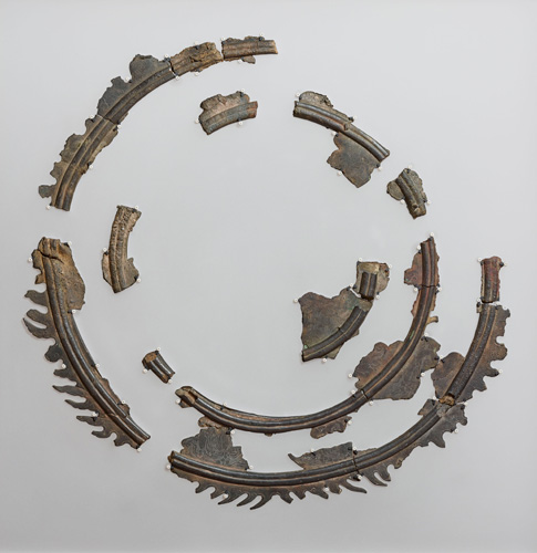 修二会(しゅにえ)の本尊である二月堂十一面観音(大観音(おおがんのん))の光背の頭光です。江戸時代の寛文7年(1667)に二月堂の火災で、本尊の光背は破損して断片が残るだけになってしまいました。本品は、それらを復元的に配置したもので、表面には華麗な文様が施されています。