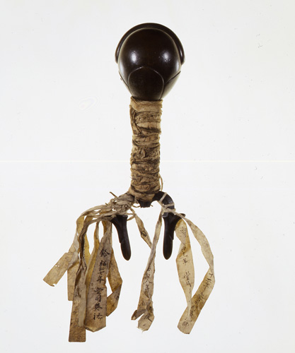 修二会(しゅにえ)の進行を監督する堂司(どうつかさ)の持ち物です。球体部分が鈴になっており、法会の時々に振り鳴らしました。歴代の堂司の名前を記した付箋(ふせん)が結び付けられています。柄(え)の先端は現状では真ん中部分が折れていますが、三叉(さんさ)に分かれた三鈷形を呈していました。