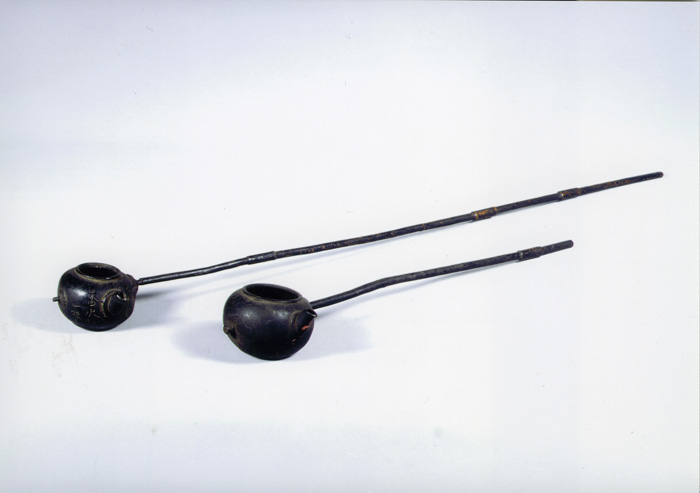 二月堂本尊(にがつどうほんぞん)に香水(こうずい)を供えた後、堂内の参詣者(さんけいしゃ)に香水を分ける際に柄杓(ひしゃく)として用いたもので、注口のついた形はお水取り独特のものです。壺(つぼ)の側面に線刻銘(せんこくめい)があり、制作年代と施入者(せにゅうしゃ)がわかります。