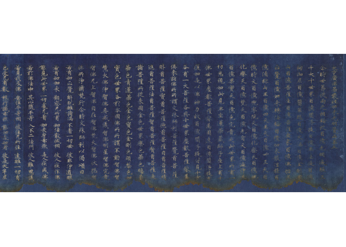 修二会の期間中、2月5日の実忠忌(じっちゅうき)に用いられたと考えられている六十巻本の『華厳経』で、江戸時代に二月堂が全焼した際、焼け跡から発見されました。一部は焼け焦げながらも、紺色の料紙(りょうし)に浮かび上がる銀色の文字は独特の美しさを醸し出しています。