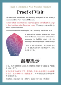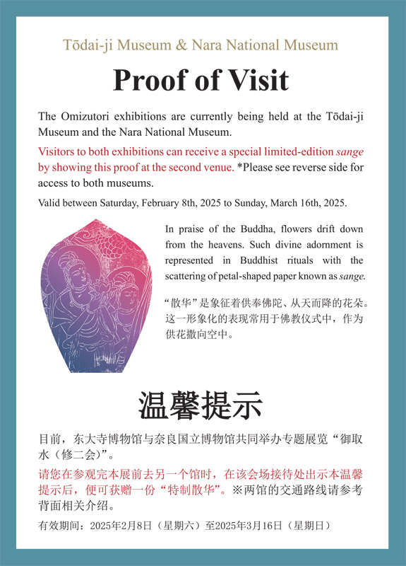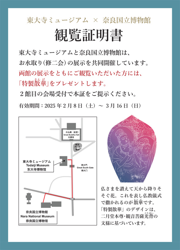 奈良国立博物館と東大寺ミュージアムの両会場の展覧会をご覧いただいた方には、限定の特製散華をプレゼントいたします。どちらかの会場受付にて観覧証明書を受け取り、もう一方の会場受付でご提示ください。