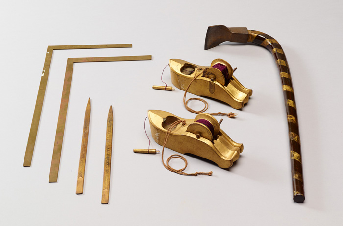 春日大社の式年造替(しきねんぞうたい)に当たって、社殿の建築に関連する儀式で使用された道具類。儀式で使うため、釿(ちょうな)や墨壺(すみつぼ)といった本来は実用の大工道具である品に華美な装飾が施されている。本品を収める箱には儀式に参列したと思われる大工の名が墨書(ぼくしょ)され、慶安3年(1650)の年紀も見える。このことから、同5年(1652)の第42次の式年造替の折に調(ととの)えられた品であることが推定される。