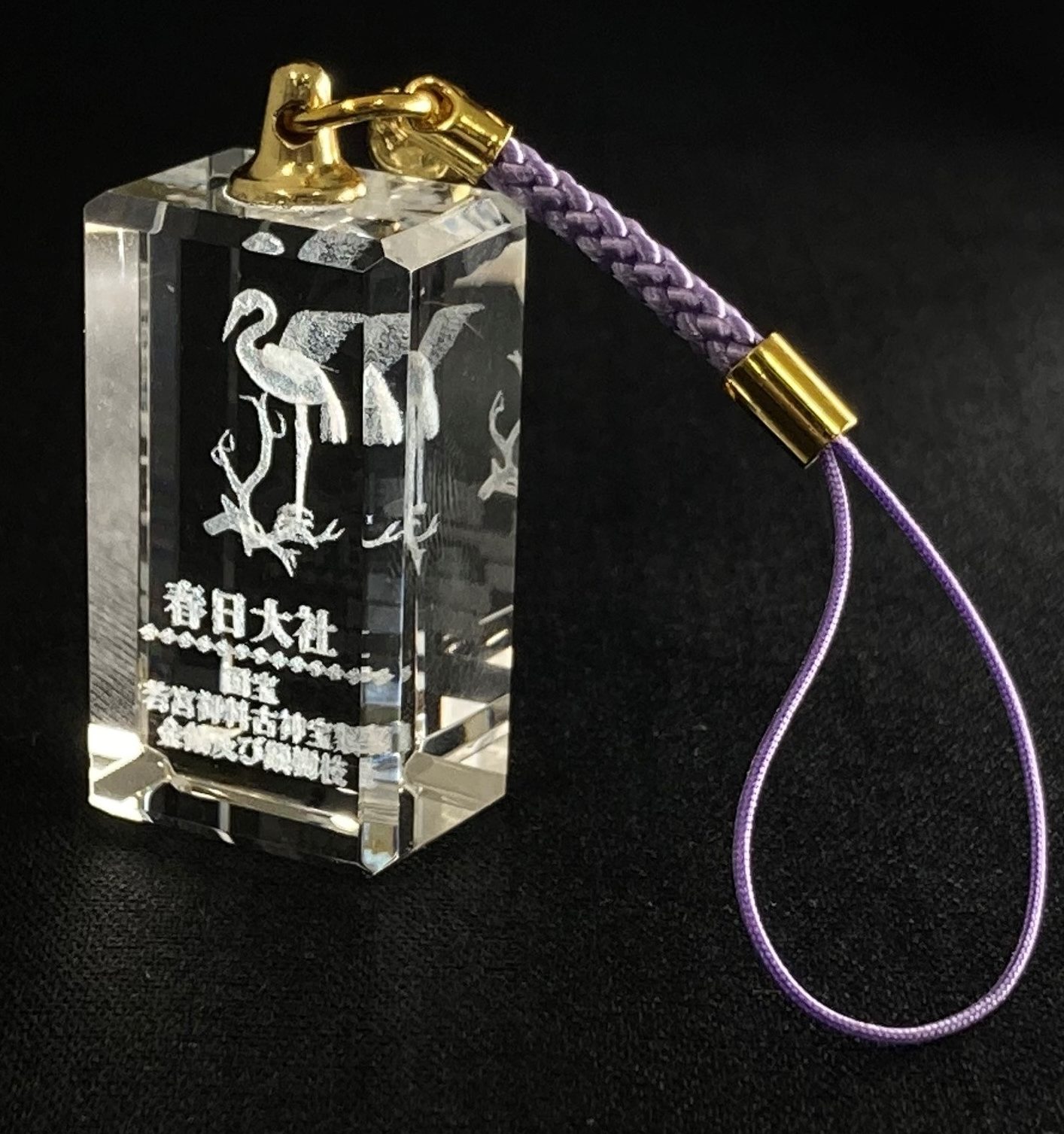 「国宝 若宮御料古神宝類 金鶴及銀樹枝」が3Dレーザー彫刻加工されたクリスタルチャーム。