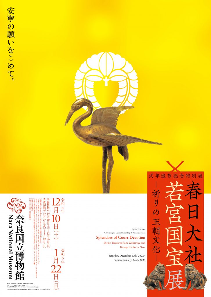 令和4年(2022)10月、春日大社の摂社、若宮神社の本殿(重要文化財)のぞうたいが完了いたします。御造替とは、社殿を造り替え、神宝や調度品などを新調する事業で、古来、20年に一度を式年として行われてきました。本展覧会はこの大事業の完成を記念して開催する特別展です。