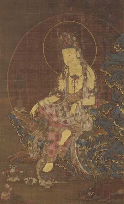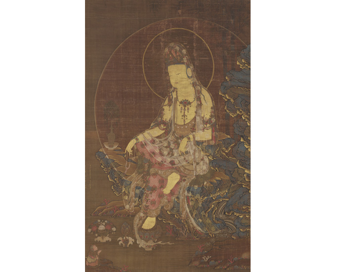 고려 시대(918~1392)에는 궁궐 주변에서 우아한 존재감이 있는 불교 회화가 다수 생산되었다. 본 도상은 관음보살이 사는 보타락산(補陀落山)의 암좌위에 비스듬히 걸터앉은 관음보살과 그를 알현하는 선재동자(善財童子)의 모습을 그렸다. 왼쪽 상단에 쓰인 낙관(落款)을 통해 본 전시품을 그린 화가와 제작 연도를 알 수 있다.