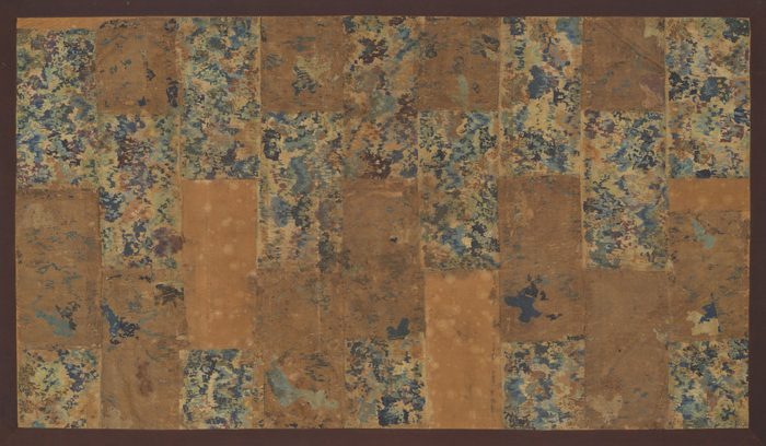 쇼무 텐노(聖武天皇, 701~756)의 일주년 제사 의례에서는 복원 길이 13m 이상으로 추정되는 장대한 번(幡)이 사용되었다. 본 전시품은 그 하단을 장식하던 비단으로, 사실감이 넘치는 원앙 한 쌍과 움직임이 느껴지는 식물을 표현하고 있다.