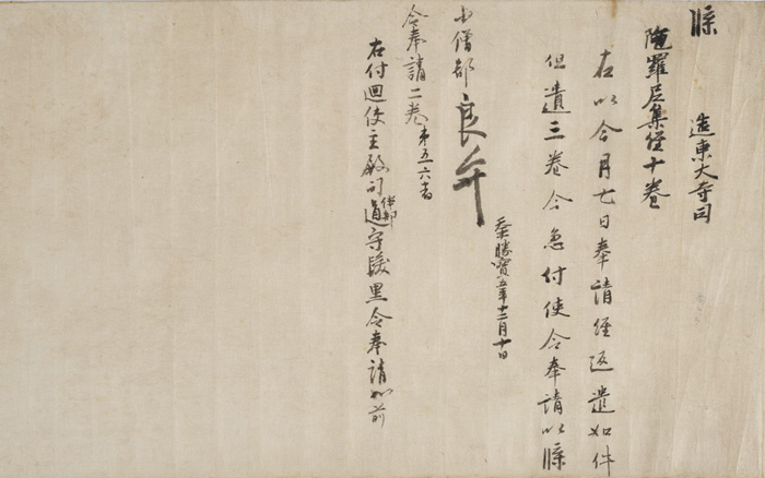 토다이지 초대 벳토(東大寺別當, 토다이지를 관리하는 직책)였던 로벤(良辨, 689~774)이 서명한 문서와 쇼토쿠 텐노(稱德天皇, 718~770)에게 중용받았던 도쿄(道鏡, ?~772)의 자필 문서 등을 엮어 한 권으로 만들었다. 로벤의 서명은 당당한 필체가 느껴지고 도쿄의 필적은 강한 힘이 눈을 끈다.