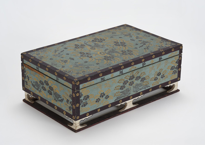 부처께 바칠 공양물을 보관하는 상자이다. 금・은니(金・銀泥)로 잉꼬와 꽃, 나비 등을 그렸다. 쇼소인에는 이와 동일한 크기, 기법, 묵서가 쓰인 또 다른 상자가 존재한다. 모두 토다이지 천수당(東大寺千手堂, 현재는 없음)에 봉납 된 것으로 보인다.