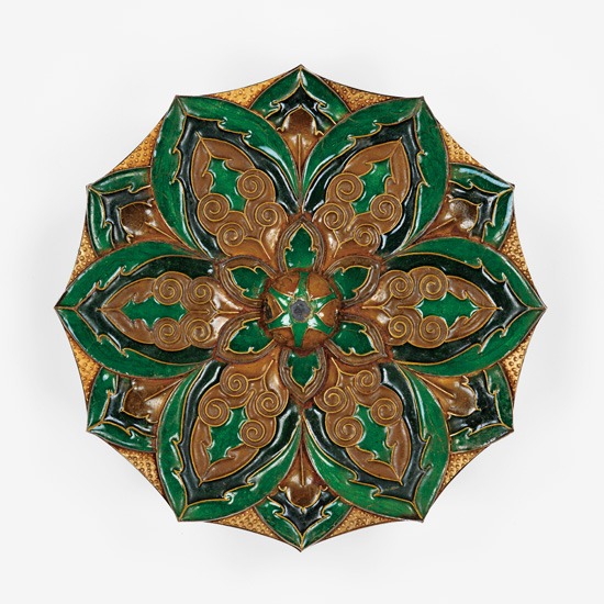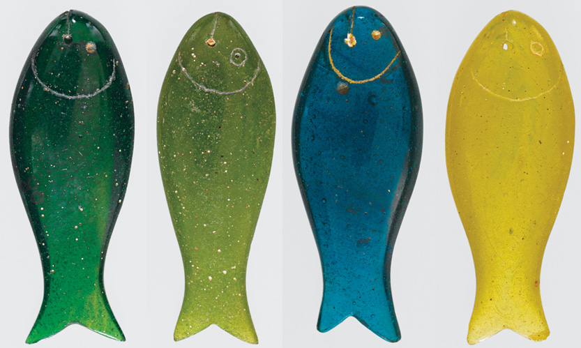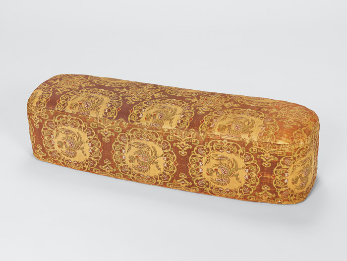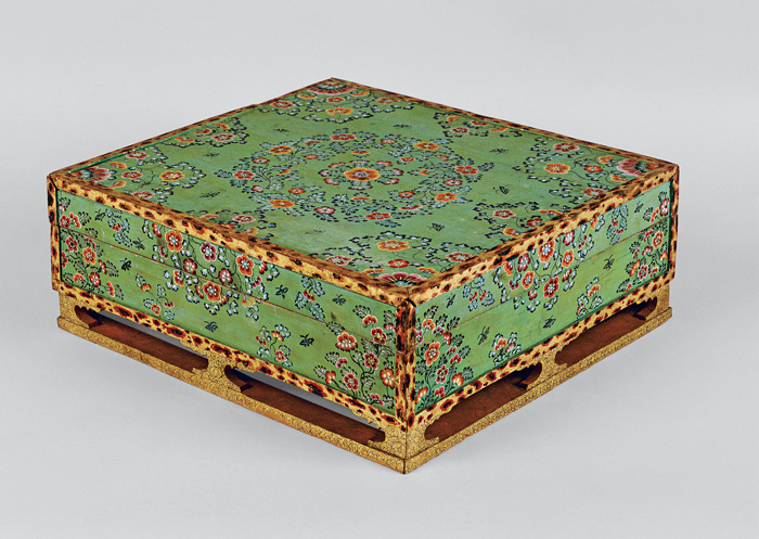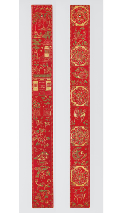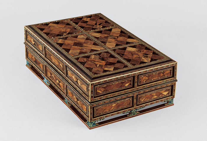 그 중에서도 비단 장식이 아름다운 「자색 바탕 봉황 장식 무릎 베개」(북쪽 창고 47)는 쇼무 텐노가 실제로 사용했던 보물로써 각별한 의미를 갖고 있습니다. 또한 「푸른 유리로 만든 자 형태의 장식」(중앙 창고 111) 및 「짙은 녹색 유리로 만든 물고기 형 장식」(중앙 창고 128)을 포함한 다채로운 색상의 유리 장신구와 금과 녹유(綠釉)의 대비가 선명한 「황금 유리 세공 보상화문양 십이능 거울」(남쪽 창고 70) 등은 아름다운 유리 세공이 도입된 보물로써 우리들의 눈을 즐겁게 합니다. 이 밖에도 「침향목 사각 상자」(중앙 창고 142) 및 「자단나무 금은 장식 서궤」(남쪽 창고 174)는 나라 시대의 고도의 공예 기술을 자랑하는 보물로써 눈길을 끕니다.
