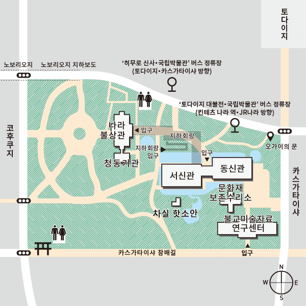 시설 전체도 나라불상관・청동기관・동신관・서신관 등 총 4개의 전시장이 있습니다.불교미술 자료연구센터에서는 불교미술에 관한 도서와 사진 등의 자료를 수집하여 연구자 및 일반인에게 공개하고 있습니다. 나라불상관 청동기관 동신관 서신관 지하회랑 불교미술 자료연구센터 문화재 보존수리소 차실 핫소안 카스가 동서탑 유적지 오가이의 문